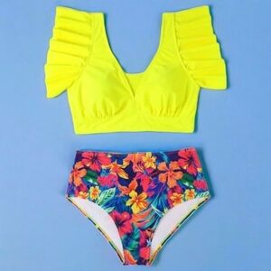 Turn heads and radiate confidence in this bold and beautiful Women's Plus Size Boho Tankini Swimsuit Set! π The cheerful yellow top features a flattering V-neckline and fluttery ruffle sleeves that add playful charm and breezy coverage. The high-waisted bikini bottoms steal the show with a vibrant tropical floral print in pink, orange, blue, and yellow tonesβperfect for expressing your fun, carefree vibe. This two-piece swimsuit offers a supportive and stretchy fit that hugs your curves in all the right places while allowing you to move freely whether you're lounging by the pool or dancing on the beach. Feel fabulous and fearless in this figure-flattering must-have made for sunshine lovers! βοΈπΊπ
