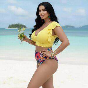 Turn heads and radiate confidence in this bold and beautiful Women's Plus Size Boho Tankini Swimsuit Set! π The cheerful yellow top features a flattering V-neckline and fluttery ruffle sleeves that add playful charm and breezy coverage. The high-waisted bikini bottoms steal the show with a vibrant tropical floral print in pink, orange, blue, and yellow tonesβperfect for expressing your fun, carefree vibe. This two-piece swimsuit offers a supportive and stretchy fit that hugs your curves in all the right places while allowing you to move freely whether you're lounging by the pool or dancing on the beach. Feel fabulous and fearless in this figure-flattering must-have made for sunshine lovers! βοΈπΊπ
