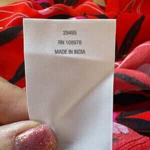 100% rayon, open front, flowing silhouette, bold red and black floral print, lightweight fabric, long sleeves, machine wash