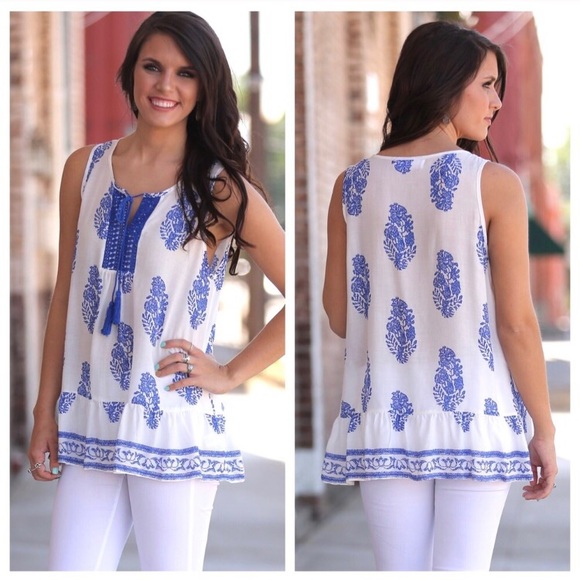 LAST ONE!!! Beautiful white with blue print sleeveless tunic. Ruffle trim, front tassel detail, lightweight, 100% rayon, and perfectly summer chic! Bust: small 20", medium 21", large 22". Length: small 26", medium 27", large 28"