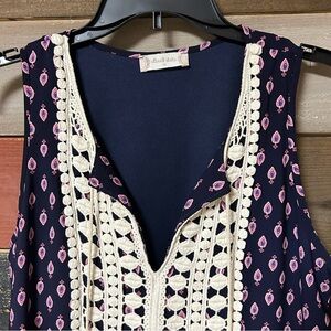 Stylish sleeveless dress with intricate lace detail. Features a bohemian pattern with a mix of colors. Perfect for casual outings.