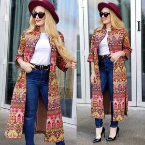 This Boho Chic Suede Long Jacket makes a bold & fab statement! A chic jacket to take your style from 0 to 100! Featuring a long line style, 3/4 length sleeves, an open front, digital multi color print throughout, & mini lace trims. Crafted in a lush, faux suede with a smooth interior.