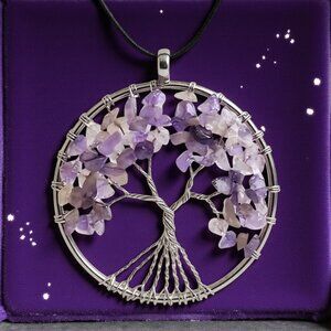 π Boho Chic Tree Of Life Necklace Genuine Amethyst Crystals Silver Plated Charm