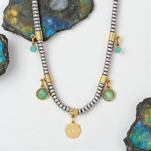 Bring effortless charm and elegance to your look with this stunning boho chic two-tone necklace! π« Crafted from high-quality stainless steel with a radiant 18K gold plating, it combines modern durability with timeless beauty. The necklace features sleek silver-tone spacer beads, shimmering gold details, dangling round charms in vibrant green hues, and a central floral medallion adorned with a sparkling accent πΌ. Its versatile design makes it perfect for layering with other favorites or wearing solo as a statement piece. Whether youβre dressing up for a night out, heading to work, or styling your everyday look, this piece adds just the right touch of color, shine, and sophistication. β¨