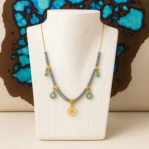boho chic necklace | two tone jewelry | floral charm necklace | turquoise enamel necklace | statement layering necklace | 18k gold plated stainless steel | trendy dainty necklace | festival jewelry | modern bohemian necklace | everyday necklace | chic charm necklace | artisan inspired jewelry | unique gift for her | layering gold necklace | colorful charm necklace