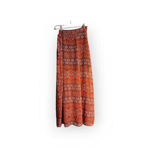 Red, Print very flowy and ethereal, lovely tribal print. 2 slits in front. Waistband has elastic in back. Lined to about mid thigh
