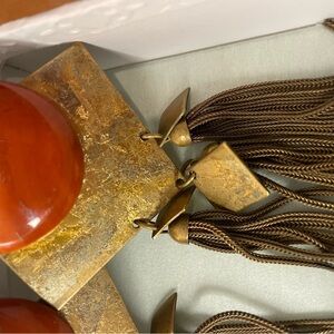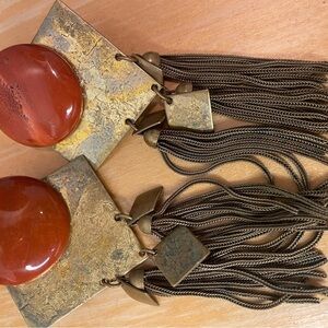 Boho Clip-On Metal Stone Earrings Gold w/ Orange