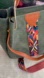 Bohemian Stylish green tote bag with a colorful geometric strap. Features tan leather accents. Perfect for school, festivals or work