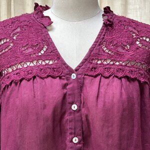 Boho Cottagecore Flowy Lace Blouse Romantic Puff Sleeve Ramie Plum Sundance, XS