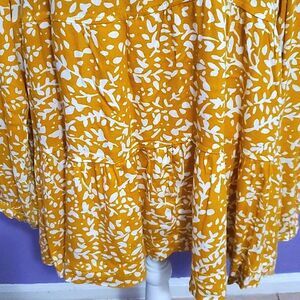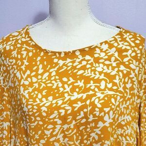 Feminine and relazed mustard yellow floral tiered top. Long Balloon sleeves with cuffs on the bottom hem. Rounded neckline with buttoned keyhole on the back. Flowy material made of 85% rayon and 15% lyocell.
