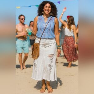 Boho Cotton 2X Knit Embroidered Lace Notch V-Neck Sleeveless Swing Tank Top
