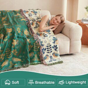 Bring color and comfort to your space with this Boho Cotton Throw Blanket, perfect for Queen or Full beds. Crafted from ultra-soft woven cotton, this cozy blanket features a stunning multicolored bird and floral print on a green background with tasseled edges for a chic, artistic touch. Measuring approximately 79" x 91", it’s ideal for layering on beds, sofas, or as a decorative accent in any bohemian-inspired room. The breathable fabric provides year-round comfort, while the vibrant design adds a unique charm to your home décor. New in Package (NIP), sealed and ready to gift or enjoy. A perfect blend of beauty and practicality for cozy living.