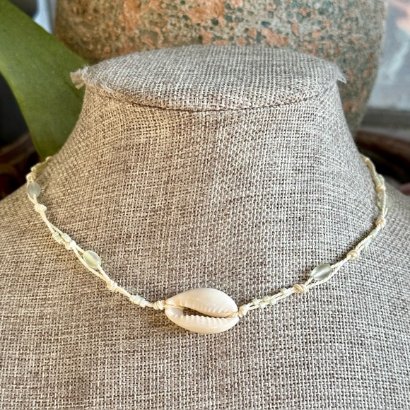 Handmade delicate cowrie shell and glass beaded necklace strung on waxed polyester cord. Finished with a coconut button closure.