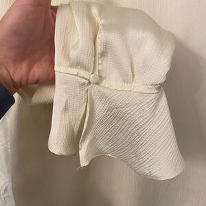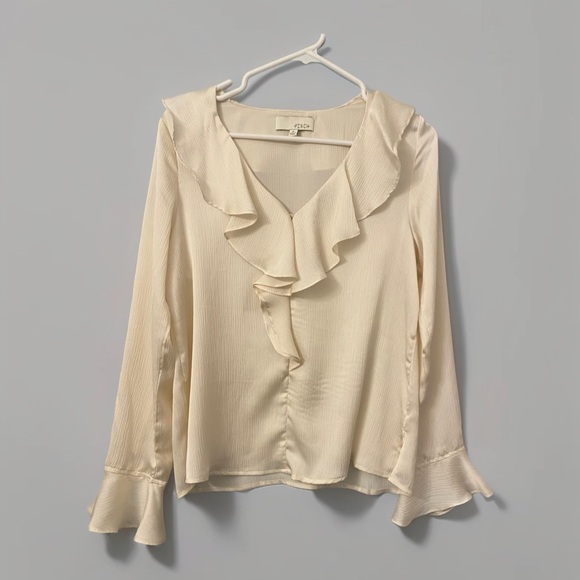 Beautiful boho-inspired blouse featuring a soft cream color with romantic ruffle detailing along the neckline and cuffs. Lightweight and flowy with a flattering drape, perfect for effortless everyday style or dressed up for brunch, work, or date night.