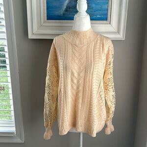 Boho Cream Yellow Fall Crocheted Lace Turtleneck Sweater medium
