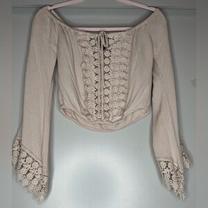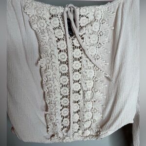 This Forever 21 blouse in a soft cream hue features long bell sleeves and a chic tie front. The cropped design is embellished with intricate details, making it a standout piece for any stylish wardrobe.