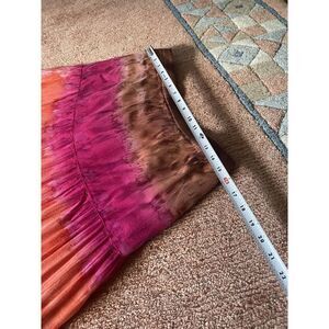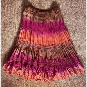 Beautiful boho-style tiered crinkle skirt with vibrant tie-dye in pink, orange, and brown tones. Features gathered sections with crochet accents and a scalloped lace-trim hem. Fully lined.