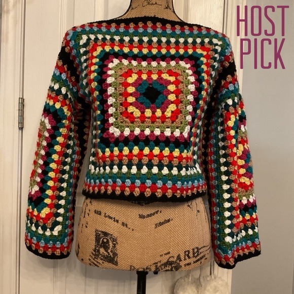 Boho Crochet Pullover Color is exact sweater in pics. Size: Small/Medium Please go by measurements. Lying flat: Bust from armpit to armpit is 17 1/2 “; Length from shoulder seam to hem is approximately 17 1/2” New Boutique Item
