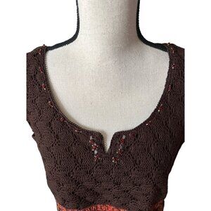 Boho Crochet Top NY Collection Babydoll Brown Retro Orange Yellow Pattern Large