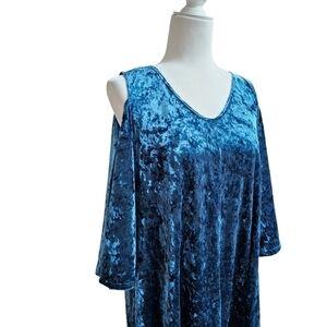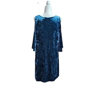 Boho Crushed Velvet Blue Cold Shoulder Shift Dress, Size Medium