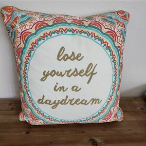 Vibrant boho style pillow featuring a motivational quote. Multicolor design with gold lettering.