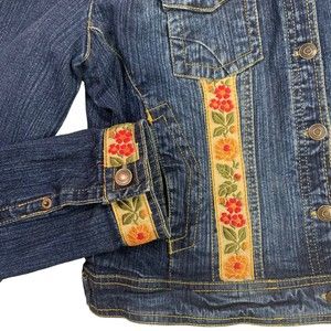 Boho Denim Jacket Hand Crafted Peace Rainbow Fringe Flower Hippie Womens Large
