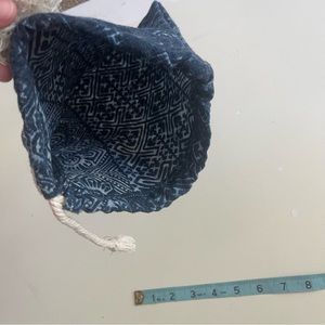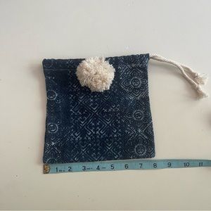 Handmade boho inspired drawstring bag with pom pom tassel. 7.5 inches by 8 inches.