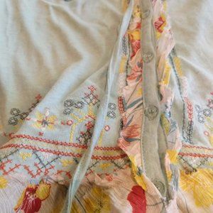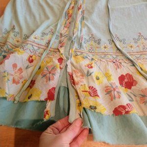 This adorable dress has so many cute details- from the floral ruffles down the straps, front and along the bottom, the embroidery details, buttons down the whole front, long tie under the bust and dual layers ruffles on bottom. 100% Cotton