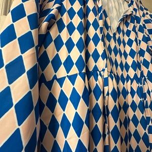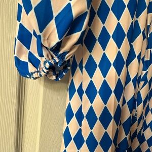 Beautiful dress! Light pink, royal blue with white outlined diamond pattern. EUC