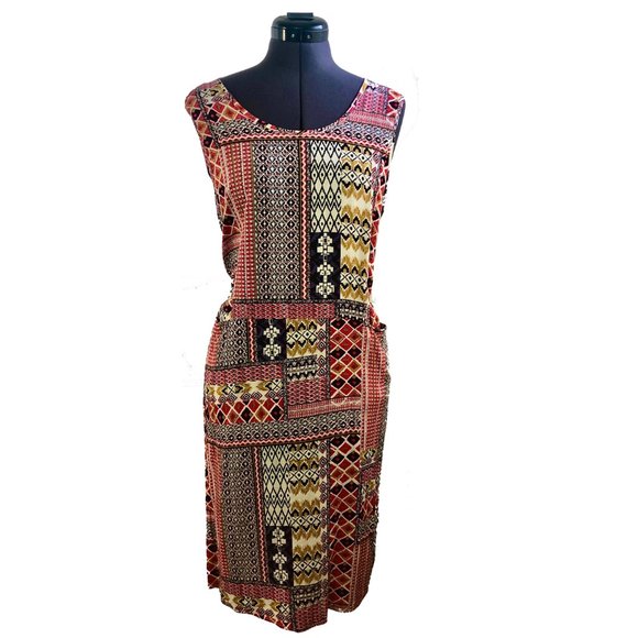 Airy boho style tank top dress with rich orange, red, and brown prints throughout. Two pockets in the front and 10 in. side slits at the hem complete the body of this piece. Light rayon should help this from sticking to you in hot weather! Easy to transition this piece from summer to fall.
