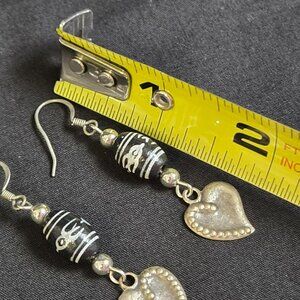 Boho Earrings Black & Silver Beaded Dzi Style with Gold Heart Dangle Accents