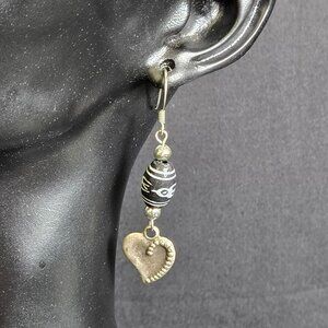 Unique handmade-style boho earrings featuring black and white etched beads with gold-tone heart dangles. The elongated bead has a Dzi-style design (eye pattern), giving these earrings an artisan, tribal-inspired look. Lightweight and eye-catching — perfect for casual or eclectic outfits.