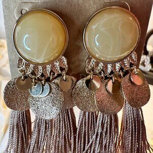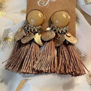 Boho Earrings | Gold Tone with Gold Color Stone | Tassel/Fringe | Pierced