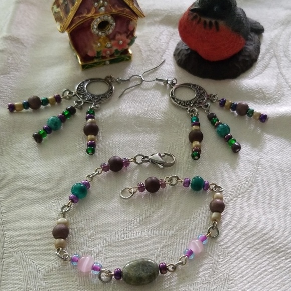Metal Center with 3 Dangle Multicolored Beads on Sterling Silver French Pierced Wires. Bracelet has a Center River Rock with Multicolored Color Glass Beads, has a Lobster Claw Clasp.
