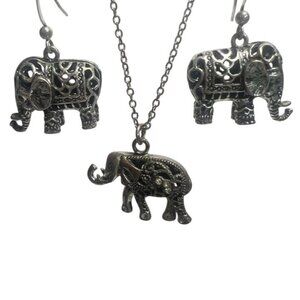 Boho Elephant Jewelry SSet Silver-Tone Filigree Necklace and Dangle Earrings