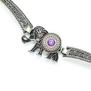 Boho Elephant Vibrant Rhinestone Engraved Silver-Tone Bracelet