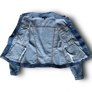 Y2K, 90s women's jacket, denim, embroidered, floral, casual, blue, stretch denim, button closure, long sleeve, studded, pre-owned, small size, regular fit.