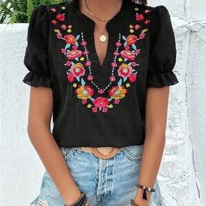 This chic black blouse showcases short puff sleeves and a stylish mandarin collar, enhanced with ruffled and embroidered details. The design adds a modern touch, making it a versatile piece for any wardrobe. Available in black this top is perfect for a casual yet sophisticated look. NWOT
