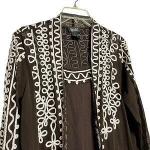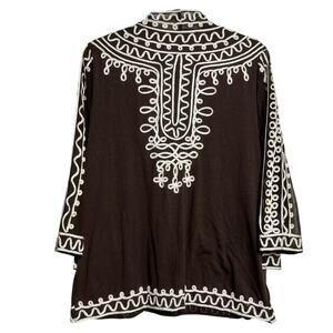 This slimming, layered blouse features delicate embroidery in a classic black and white color scheme, perfect for both business and boho styles. The sheer 3/4 length sleeves add an elegant touch.