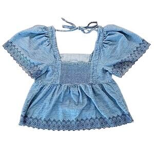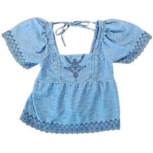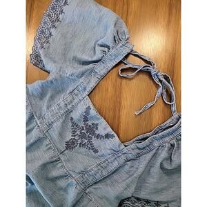 Boho Embroidered Chambray Denim Tunic Top Women’s S 100% Cotton Peasant Blouse