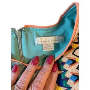 Add a touch of boho-chic elegance to your wardrobe with this stunning Champagne and Strawberry Shift Dress! This fully lined, sleeveless dress features a soft champagne base with intricate multicolor geometric embroidery in shades of blue, peach, navy, yellow, and black, creating a beautifully eye-catching design. The light blue center panel adds a unique contrast, while the peach piping along the armholes and neckline provides a polished finish. The full embroidered hemline enhances the vibrant detail, making this dress a true statement piece. A hidden back zipper ensures a seamless fit, while the comfortable, lightweight fabric makes it perfect for brunch, vacations, spring/summer events, or casual outings. This dress is in excellent condition and will be quickly shipped with care from a smoke-free, pet-free environment. Please note, colors and measurements may vary slightly due to differences in lighting, screen resolution, and positioning.