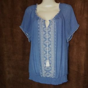 A B Studio Boho Embroidered Peasant Top Size Large. Southwestern designed embroidery down the front center. Top has an elastic scoop neck with a split cut & tassel tie. Flat measurements: 23" across armpits, 21.5" long. Ask questions if needed. Reasonable offers accepted.