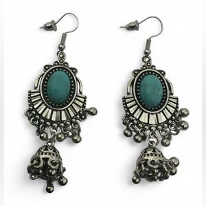 Boho Ethnic Native Silver & Turqoise Dangle Earrings Stone & Bell Drop Design