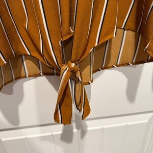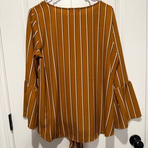 Step out in style with this elegant mustard striped blouse. The chic bell sleeves add a touch of sophistication, making it perfect for any occasion. Ties in front
