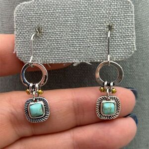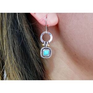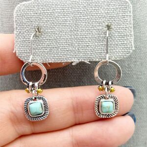 Boho Faux Turquoise Square Circle Dangle Earrings Silver Tone Boho Chic Small
