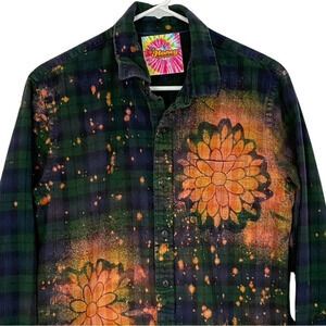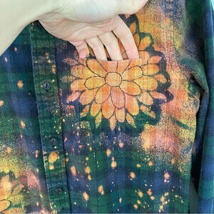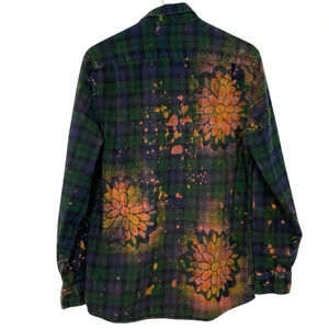Boho Flannel Shirt Floral Stencil Bleached Plaid Womens Medium Large Blue Green