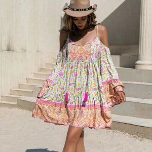 Boho Floral Cold Shoulder statement sleeved Ruffle Hem Mini Dress