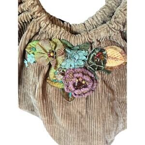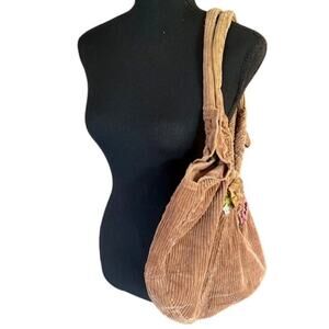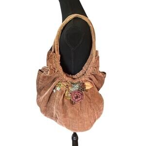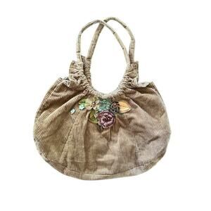 keywords: Corduroy boho shoulder bag with floral appliqué, Cappelli Straworld vintage tote, 90s Y2K cottagecore purse, embroidered slouchy hobo bag, textured fall handbag, brown corduroy floral bag, indie style festival purse, artisan beaded tote bag with floral design