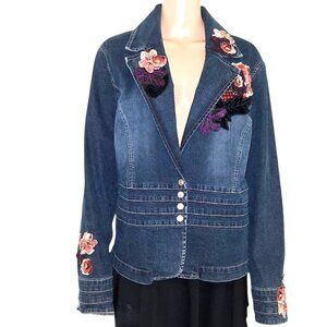 Boho style embellished denim jacket with vibrant multicolor floral embroidered and lace appliques handwork one-of-a-kind original design. Snap button front closure and cuffs, detail stitches around the waist and cuffs for a structured silhouette. Cotton/polyester blend, hand wash cold water. Pit to Pit 22 Inch Length 25 Inch Size XL.