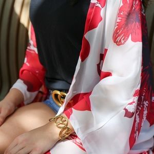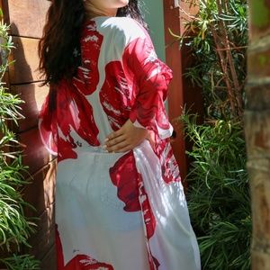 A must have for every woman. Beautiful, lightweight kimono featuring a gorgeous red flower print on white. Great pairing with your favorite black dress or a trip to the beach. Tie in the front and match with heels and funky jeans for a cool vibe. Other styles available in closet.